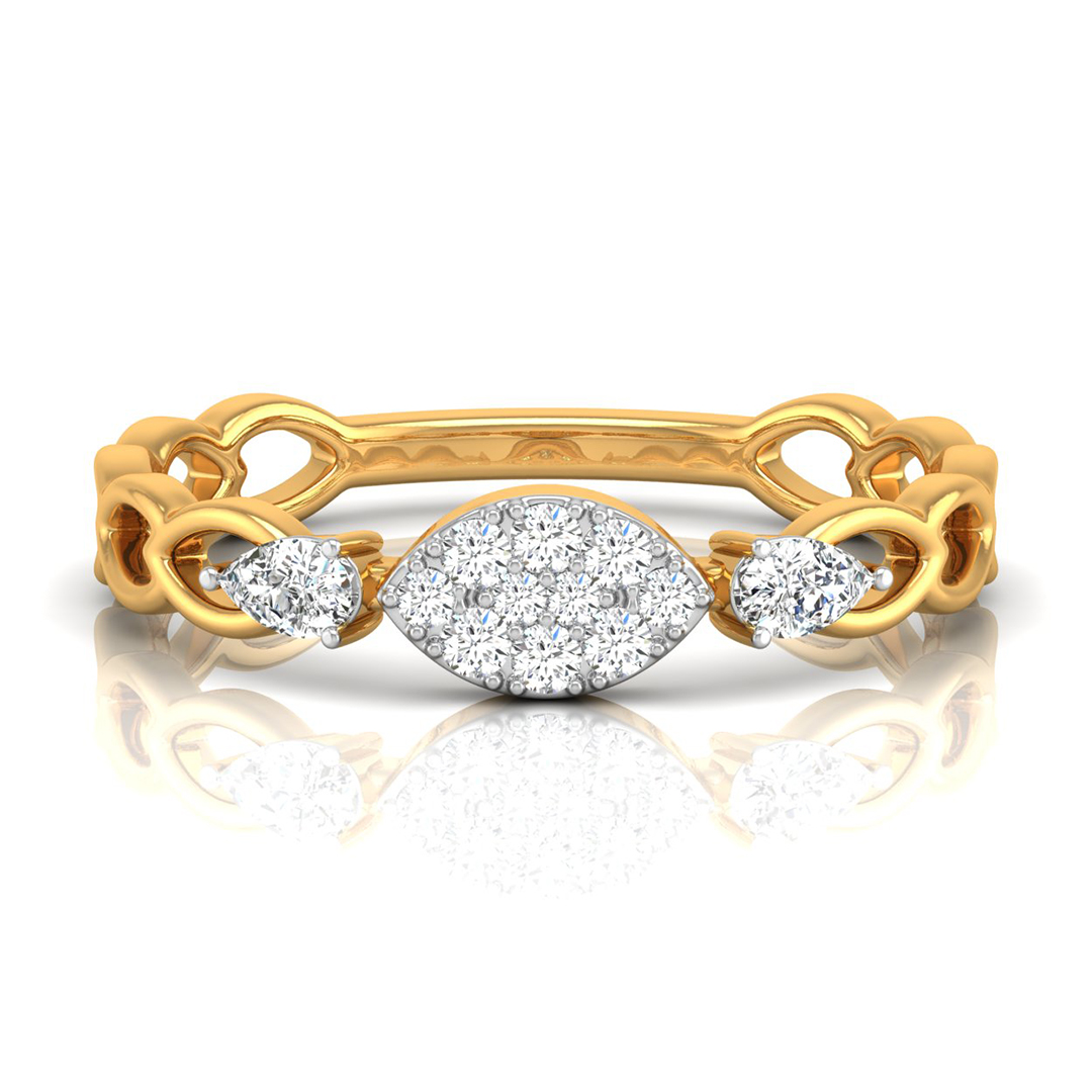 A diamond-studded circle meets floating brilliance in this elegant gold ring. Symbolizing wholeness and harmony, it’s a modern piece with timeless sparkle.